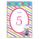 Une carte de table à thème sucrée et mignonne. Avec des rayures et des bonbons colorés. Personnalisez-vous facilement pour votre fête d'anniversaire, Bat mitzvah et plus encore!