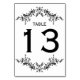 This elegant table number features a timeless black-and-white design with ornate botanical flourishes framing the top and bottom. Delicate, hand-drawn greenery accents surround a clean layout, highlighting a bold, oversized numeral beneath a refined “Table” heading. The classic typography and symmetrical detailing create a sophisticated look that pairs beautifully with formal, vintage, or minimalist décor themes.