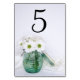 Ces jolies marguerites blanches en bleu Jar Vase Mariage Les numéros de table ajoutent une touche d'élégance aux tables de votre fête de jardin d'été, douche nuptiale ou dîner de réception de mariage. Ces élégantes cartes de numéro de table à mariage fleurie et personnalisée sont ornées d'une photographie florale d'un pot en verre bleu chic rustique rempli de fleurs marguerites blanches et de satin blanc.