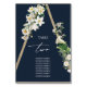 Une belle pyramide de bois rustique de style bohème avec des flancs d'aquarelle blancs en cascade sur le côté et un arrière - plan bleu. Un design unique qui utilise des plantes vintages d'aquarelle blanche sur une structure triangulaire bohème. Un charmant design floral blanc aux caractéristiques rustiques et géométriques et à l'élégante typographie de script. Un design élégant de numéro de table de mariage avec des éléments modernes. Des invitations de mariage et d'autres articles de papeterie sont également disponibles. Customisez le numéro et achetez chaque numéro de table individuellement en fonction du nombre de numéros de table dont vous avez besoin.