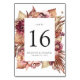 Cartes de numéro de table élégantes et fleuries du désert avec des fleurs d'aquarelle bordeaux, violet, rousse et corail et des feuillages luxuriants dans de riches tons de terre brune. Personnalisez en ajoutant le numéro de table, vos noms, la date du mariage, etc. Le design se répète à l'envers. Coordonnée avec notre suite de faire-part de mariage florales Boho Desert.