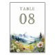 Amaze your guests with this elegant wedding table number featuring beautiful mountains and wildflowers.