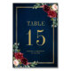 Élégante et moderne carte de numéro de table de mariage florale géométrique romantique aquarelle avec de belles roses aquarelles burgundy / marsala, rose blush, pêche, bleu marine avec feuillage assorti sur fond en bois rustique bleu marine et cadre doré. Parfait pour un mariage d'automne / mi-été. Veuillez trouver plus de modèles et variations assortis dans ma boutique "blissweddingpaperie". Et n'hésitez pas à me contacter pour une personnalisation ou des articles assortis supplémentaires.