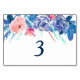Voici une jolie carte de table mariage qui utilise le bleu comme couleur primaire, et l'embellit avec des touches de rose et de pêche. La bordure supérieure est une image de bouquet de pêche et de roses bleus, avec des fleurs violettes roses complémentaires, bleu et feuilles d'aqua. Sous la bordure florale se trouve le numéro de tableau en bleu. Tout est placé sur un arrière - plan blanc mariage. Le dos de la carte est identique. Assurez-vous de voir les produits mariages correspondants, y compris les invitations, dans notre magasin.
