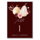 Ce numéro de table mariage est composé de citrouilles blancs et jaunes aquarelles ornés de fleurs bordeaux, marrons et roses rousses sur les feuilles d'automne. Pour une personnalisation plus avancée de cette conception, cliquez sur le BOUTON OUTIL DESIGN BLEU ci-dessus