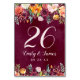 Les cartes de numéro de table de mariage de style romantique rustique présentent un monogramme rose pâle élégant avec des chiffres encadrés par une aquarelle fleurie avec de beaux roses, dahlias, des fleurs de pivoines et de la verdure, dans une magnifique palette automnale de rouge bordeaux, jaune doré, orange pêche, rose roux et tons verts. Rich bordeaux couleur arrière - plan rouge avec apparence texturée.