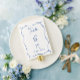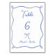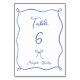 Numéro de table du Mariage Whimsical bleu français, avec un arc dessiné à la main et un cadre ruban ondulé et une police de style écriture manuscrite. Personnalisez avec des noms.