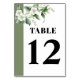 Cette carte de numéro de table mariage sophistiquée présente une belle combinaison de verdure et de fleurs blanches dans un cadre blanc charmant. Le côté gauche de la carte est orné d'une bordure verte sage, ajoutant une touche d'élégance. Dans le coin supérieur gauche, une branche gracieuse agrémentée de fleurs blanches et de verdure luxuriante crée un point de contact captivant. Le texte sur la carte est présenté dans une typographie audacieuse et accrocheuse, renforçant encore l'élégance globale de ce design.