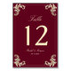 Add timeless elegance to your reception décor with this burgundy and gold baroque wedding table number. Featuring a rich burgundy background framed with ornate vintage gold baroque flourishes, this design creates a luxurious and refined look for your wedding reception tables.