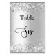 Le numéro de table est écrit avec un élégant script de style écrit à la main. Des lettres noires, un arrière - plan blanc à l'avant et un arrière - plan faux argent avec de la poussière de parties scintillant, brillent à l'arrière.