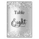 Le numéro de table est écrit avec un élégant script de style écrit à la main. Des lettres noires, un arrière - plan blanc à l'avant et un arrière - plan faux argent avec de la poussière de parties scintillant, brillent à l'arrière.