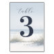 This wedding table card features a serene beach scene with soft, muted tones of light blue sky and sandy beige foreground. The design includes tall grasses at the bottom edge, adding texture to the composition. Dominating the center is a large numeral "3" in bold, dark navy color, complemented by elegant cursive script above it that reads "table." Below the number, customizable placeholder text for names and dates appears in uppercase serif and simple sans-serif fonts, maintaining the same dark navy hue. The overall layout is balanced and centered, conveying a calm, inviting, and slightly romantic mood perfect for weddings or formal gatherings.