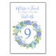 Une jolie carte de numéro de table de mariage à thème en couronne bleue unique pour votre événement mariage.