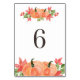 Table 6. Carte de numéro de table festive avec illustrations aquarelles de citrouilles et de feuilles d'érable. Ce numéro de table citrouille est parfait pour les mariages de Thanksgiving et d'automne, la remise de diplôme, les baby showers, les douches de mariée et autres événements.