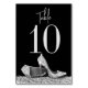 Elégante Glam Silver et Black High Heel Stiletto Chaussure Numéro de table Carte avec design et polices modernes et tendance, parfait pour sa fête d'anniversaire, douche nuptiale, événement d'affaires de mode, 16 sucré, quinceanera, bat mitzvah ou toute fête célébrant luxe et amusant avec un thème de chaussures de pompage haut talon.