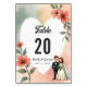 Cet élégant numéro de table à mariage floral aquarelle est parfait pour un mariage moderne. Le design romantique présente un cadre floral aquarelle élégant avec une illustration de mariée et de mariée et une calligraphie noire sur un arrière - plan blanc.