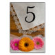 Customisez ces charmants numéros de table Daisy Trio et Mariage campagnard dentelle et créez une carte différente pour chaque table à votre douche nuptiale décontractée et rustique, réception mariage ou fête de grange fiançailles. Ces cartes de numéro de classement de ranch ou de table de style agricole décontracté et classe sont dotées d'une photographie florale surannée de deux marguerites roses et d'une fleur de marguerite orange, d'un mouchoir en lin vintage et d'un voile de mariée blanc avec un arrière - plan de bois de grange patiné brun.