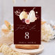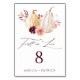 Ce numéro de table mariage est composé de citrouilles blancs et jaunes aquarelles ornés de fleurs bordeaux, marrons et roses rousses sur les feuilles d'automne. Pour une personnalisation plus avancée de cette conception, cliquez sur le BOUTON OUTIL DESIGN BLEU ci-dessus