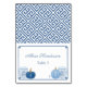 Cette conception est vendue sous forme d'une carte plate de 3,5x5 pouces que vous devrez plier (ou marquer et plier) en deux pour faire des cartes de place individuelles avec une taille pliée de 3,5x2,5 pouces. Ce design classique présente une aquarelle Ginger Jar et des citrouilles bleus. Le design comporte également une bordure de clé grecque à l'avant et un motif de clé grecque à l'arrière. Vous pouvez modifier la couleur de contraste (actuellement bleu foncé) en entrant l'outil de conception ("cliquez pour customiser plus loin" sous les zones de personnalisation du texte) et en modifiant les couleurs arrière - plans.