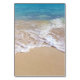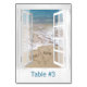 Ouvrez la fenêtre avec des rideaux donnant sur les noms des jeunes mariés en forme de cœurs de plage et de sable avec une mer écumante pour la disposition de la table de réception de mariage.
