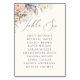 Carte 'table six' de mariage à fleurs bleues poussiéreuses et crème avec écriture élégante et modèle de texte pour les noms des invités.