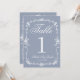 Numéros de table de mariage botaniques floraux élégants et distingués, blancs et bleus poussiéreux. Comme vous le voyez, il comporte un fond bleu argenté avec un script blanc qui correspond à l'ensemble de la suite. Et cadre floral avec contour blanc.