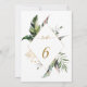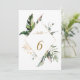 Cette carte de numéro de table de mariage présente un feuillage tropical vert aquarelle, une feuille de palmier, une feuille de bananier avec un cadre en forme de diamant doré. C'est parfait pour un mariage sur la plage, en été ou de destination.