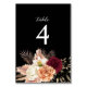 Ajoutez une élégance audacieuse à vos tables de mariage avec cette carte de numéro de table florale romantique. Le fond noir dramatique met en valeur de douces fleurs aquarelles en bourgogne, ivoire et pêche—parfait pour les célébrations automnales maussades ou les mariages bohèmes élégants. Un moyen élégant de guider les invités à leurs sièges.