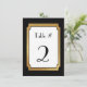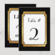 Élégant numéro de table plat personnalisé pour réception de mariage. Fabriqué dans un beau cadre noir de style Art déco entourant un cadre de ton doré plus fin qui borde la zone de texte blanc. Le texte noir est prêt à être personnalisé pour chaque table à votre mariage.