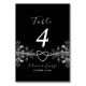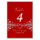 Numéro de table de mariage bohème, chic, élégant, rouge, noir et blanc avec cœur de corde argentée et dentelle florale dorée.