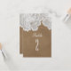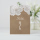 Numéro de table de mariage rustique marron et dentelle blanche. Les articles assortis de cette collection sont disponibles.