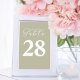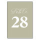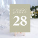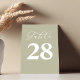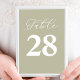 Ce design comprend une carte de numéro de table mariage avec un script de calligraphie élégant, simple, une typographie minimaliste et simple, parfait pour une réception de mariage ou tout événement avec une couleur verte sage et solide.