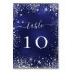 Simple et élégant. Arrière - plan bleu marine, la couleur bleue est inégale. Décoré de parties scintillant en faux argent, pétillant. Personnalisez et ajoutez des numéros de table. Texte blanc.
