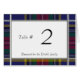 Carte de tente de numéro de table de réception de mariage élégante, faite avec le tartan plaid du clan MacBeth en arrière-plan. Une zone de texte blanche, au milieu, est entourée d'un cadre en étain. Personnalisez le numéro et le texte pour chaque table, lors de votre réception.