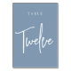 Des cartes numériques simples et chic en bleu Dusty et blanc font une déclaration élégante à votre mariage ou événement. Le design comporte "table [nombre]" dans un mélange de sérigraphie classique et de lettres manuscrites. Le design se répète de part et d'autre. Cartes numérotées individuellement vendues séparément; commandez chaque numéro de table individuellement de notre collection.