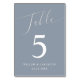 Numéro de table de mariage minimal et élégant avec texte de script moderne qui dit "Table" en haut sur un arrière - plan bleu poussiéreux.