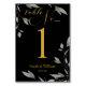 Un script noir et or avec une douce ondulation eucalyptus feuilles élégante carte de numéro de table de mariage et d'événement qui peut être customisé avec n'importe quel numéro de table. Les graphiques apparaissent des deux côtés de cette carte.