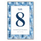 This elegant wedding table card features a bold, dark blue number "8" centered on a white background, surrounded by a delicate pattern of stylized pine trees in varying shades of blue, creating a frosty forest ambiance. The design includes cursive typography for the word "table," with names and date presented in clean serif and sans-serif fonts, adding a formal touch. The cool color palette and serene motifs evoke a tranquil, wintery mood, perfect for a sophisticated celebration. Ideal for weddings or formal events, this card combines modern artistry with classic elegance to enhance your table setting.