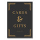 This elegant wedding tabletop sign features a sophisticated dark background with gold accents, creating a luxurious and formal atmosphere. The design includes the phrases "CARDS & GIFTS" in bold serif typography, complemented by an ornate ampersand and a simple "thank you" at the bottom, all framed by intricate geometric borders. The classic style blends traditional elements with modern minimalism, making it perfect for expressing gratitude at your special event. Ideal for guiding guests to cards and gifts, this sign adds a touch of refinement to any wedding celebration.