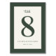 This wedding table card features a minimalist and elegant design with a large, bold number "8" at the center, set against a cream background. The deep forest green color palette adds sophistication, while the clean layout emphasizes simplicity and balance. The typography combines a cursive font for "table" and a modern sans-serif for names and date, creating an understated yet refined aesthetic perfect for formal occasions. Ideal for weddings, this card conveys a calm and composed mood through its restrained use of color and uncluttered arrangement.