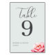 Cette carte de table de mariage présente un design minimaliste avec un fond gris clair doux qui crée une atmosphère élégante et sereine. La mise en page comprend le mot "Table" en écriture cursive en haut, suivi d'un grand chiffre "9" en gras comme point focal. Une délicate fleur de lotus rose ajoute une touche de beauté naturelle au coin inférieur droit, équilibrant la composition. Les champs de texte personnalisables permettent une personnalisation avec les noms et les dates, ce qui la rend parfaite pour ajouter une touche personnelle à votre jour spécial. Le style général est discret mais sophistiqué, idéal pour créer une ambiance raffinée lors de votre réception de mariage.