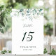 Ce numéro de table mariage est composé d'eucalyptus à aquarelle peinte, de feuilles verts botaniques et bleu clair avec calligraphie moderne.