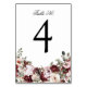 Elégante carte de numéro de table de mariage floral et bordeaux.