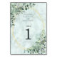 Des bouquets d'aquarelle de verdure eucalyptus décorent le cadre géométrique or sur ces élégants numéros de table botanique de mariage. L'arrière - plan est une élégante texture en marbre.