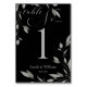 Un script noir et argent avec une douce ondulation eucalyptus feuilles élégante carte de numéro de table de mariage et d'événement qui peut être customisé avec n'importe quel numéro de table. Les graphiques apparaissent des deux côtés de cette carte.