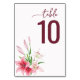 Cette élégante carte de table de mariage présente un design minimaliste avec un fond blanc épuré, créant une atmosphère aérienne et sophistiquée. Le numéro "10" est visible en gras, dans une police serif bordeaux, complété par le mot "table" écrit dans une écriture cursive assortie au-dessus. Une délicate illustration aquarelle de lys roses avec des feuilles vertes ajoute une touche de beauté naturelle au coin inférieur gauche, améliorant le charme général. Le mélange harmonieux de typographie moderne et d'éléments botaniques traditionnels fait de cette carte un élément parfait pour ajouter une touche raffinée à votre réception de mariage.