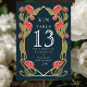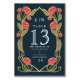 Capture timeless elegance with this Art Nouveau-inspired Table Number! Featuring pink peonies, leaves against a rich blue background, this design sets the tone for a sophisticated celebration. Perfect for weddings, galas, and milestone events! Please note that the gold on this product is NOT real foil; it is printed flat. ATTENTION: Items are printed exactly as they appear on your screen when you add them to the cart, so personalize and add each table number you need to your cart individually.