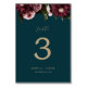 Numéro De Table Élégant Turquoise foncé Bourgogne Floral Mariage