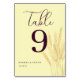 Ce design élégant de numéro de table présente un fond jaune pâle et doux avec un "9" serif gras et grand de couleur bordeaux profond, créant un contraste saisissant. Le mot "Table" est écrit de manière élégante au-dessus du numéro, tandis que des tiges de blé délicates ajoutent une touche organique sur le côté droit. Un texte personnalisable en bas permet une personnalisation, ce qui le rend parfait pour les mariages ou les événements formels. La mise en page minimaliste et la palette de couleurs chaudes dégagent sophistication et charme, idéal pour améliorer l'ambiance de toute célébration.