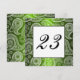 Un imprimé en satin vert scintillant profond est superposé dans un élégant motif de dentelle de paisley blanc pour une réception de mariage ou une carte de numéro de table de fête élégante et unique.